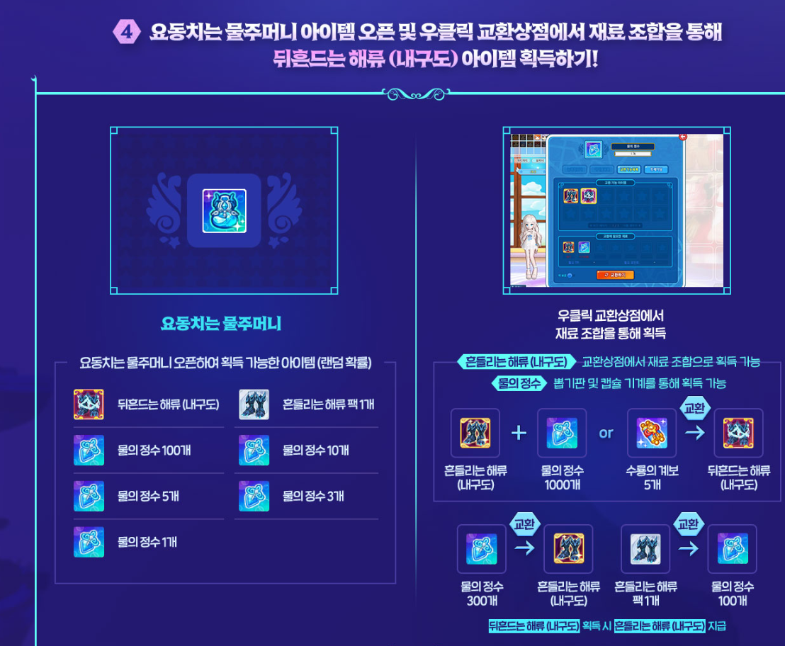- 요동치는 물주머니 1개 사용 시 2개 아이템을 랜덤 획득합니다.