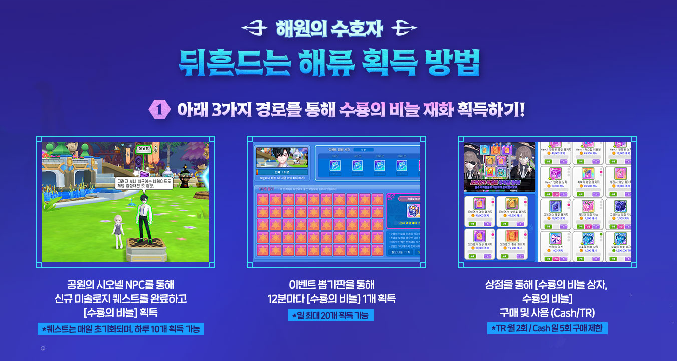 - 게임 접속 12분 마다 수룡의 비늘 1개를 획득할 수 있으며 일일 20개까지 획득 가능합니다.