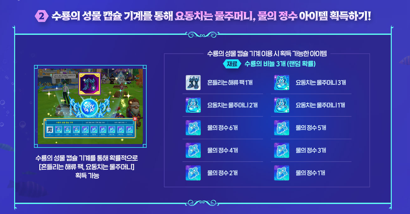 - 수룡의 성물 캡슐 기계는 1회 이용 시 수룡의 비늘 3개가 필요합니다. (캡슐 아이템은 모두 선물/보관 불가)