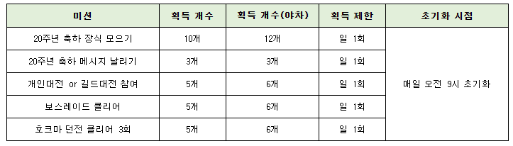 * 20주년 축하 장식은 모두 교환이 불가하며, 이벤트 종료 시 삭제됩니다.