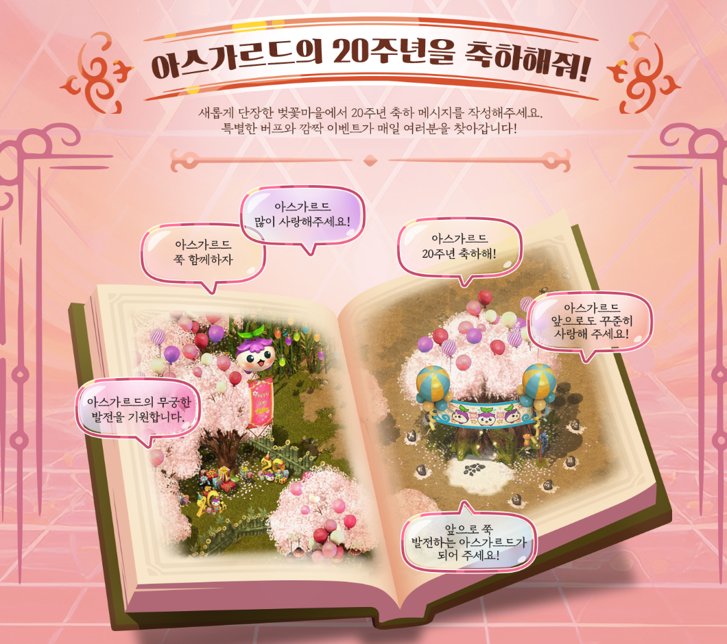- 20주년 축하 메시지 날리기 이벤트는 벚꽃마을에서만 가능합니다.