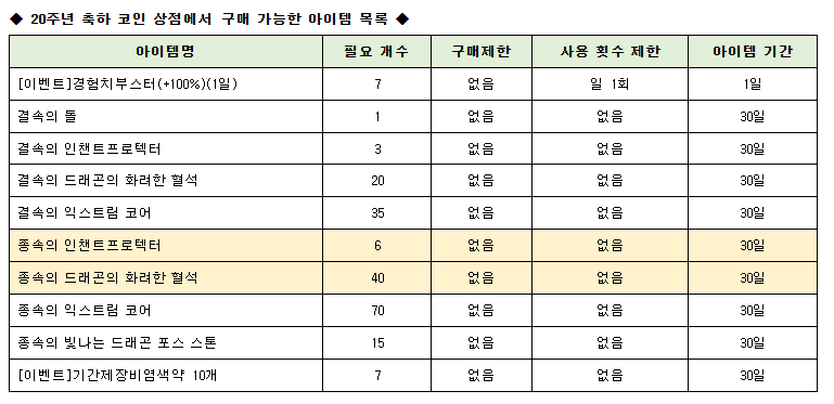 * 20주년 축하 코인 상점의 모든 아이템은 구매 시 캐릭터에 전속되어 교환할 수 없습니다.