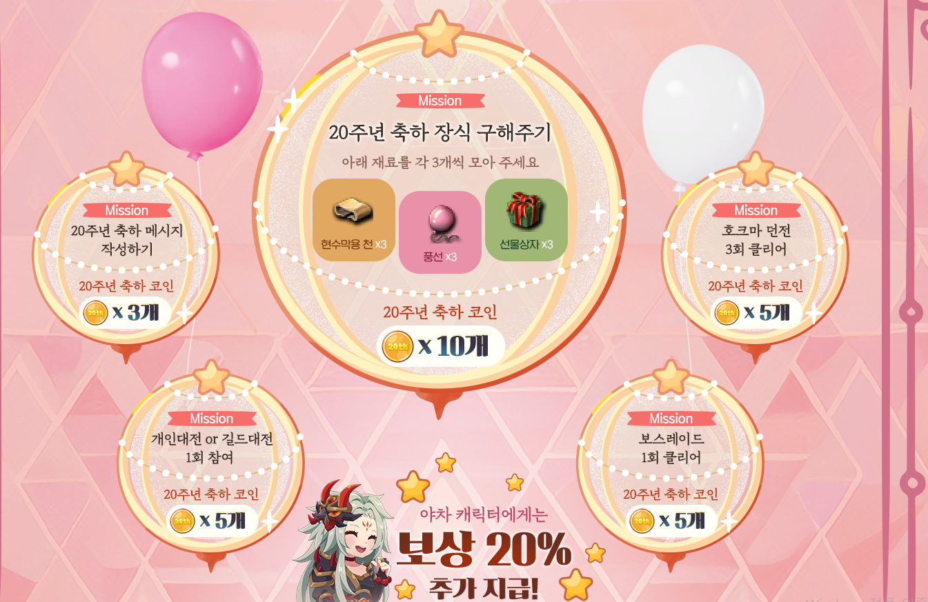 - 신규 직업: 야차 캐릭터로 미션 클리어 시, 20주년 축하 코인이 20% 추가 지급됩니다.(단, 소수점 이하는 버림)