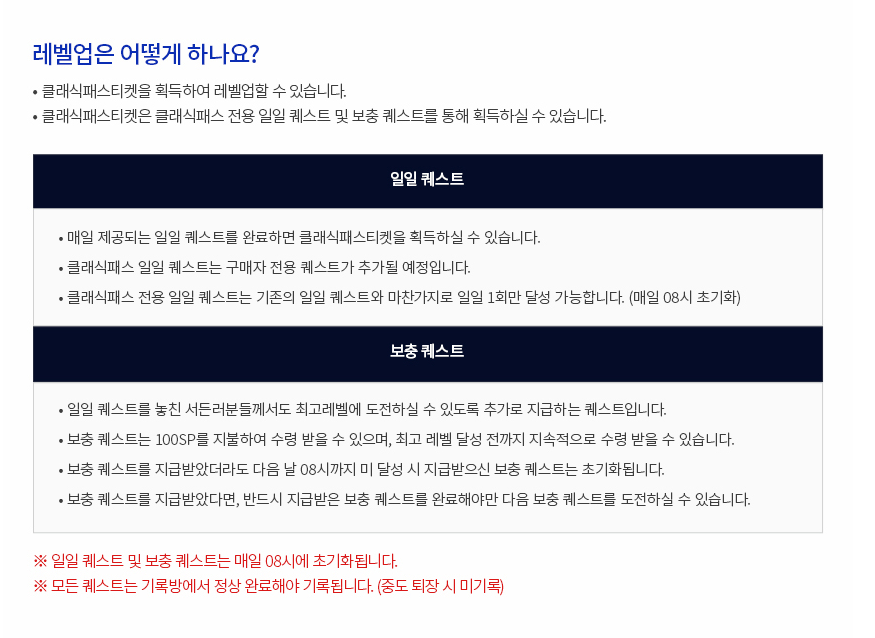 클래식패스 전용 일일퀘스트는 기존의 일일 퀘스트와 마찬가지로 일일 1회만 달성 가능합니다 (매일 08시 초기화)