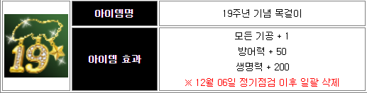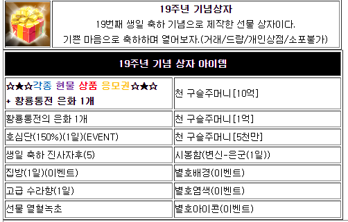 19주년 기념 상자에서는 랜덤 하게 특별한 응모권과 아이템이 나온다고 합니다.