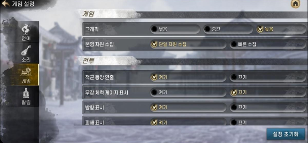 | 적군 등장 연출 | 게임 내 적군 등장 시 연출 효과 표시 켜기/끄기 가능 |