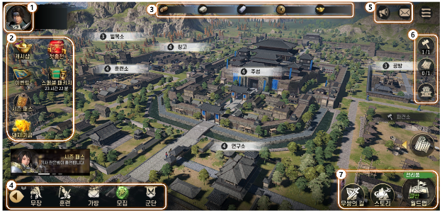 | 퀵메뉴 리스트 | 본영, 무장, 훈련, 가방, 모집, 군단, 랭킹, 파견 |