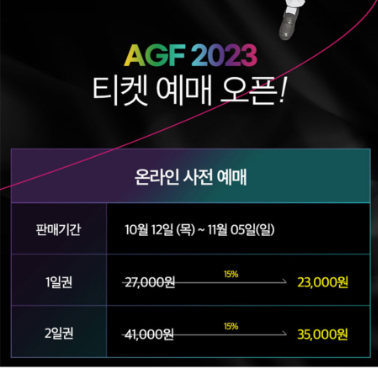 AGF 2023 티켓일정은 10/12(11:00) ~ 12/03 (17:00)입니다.