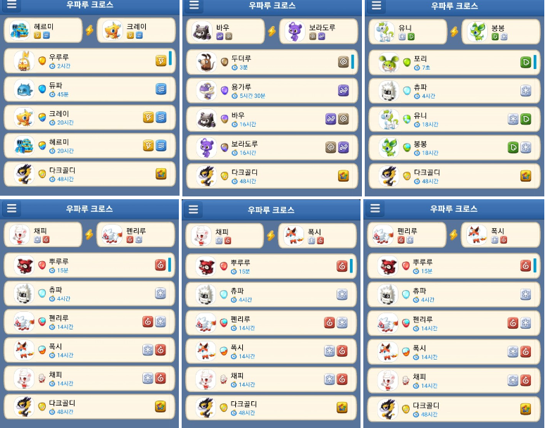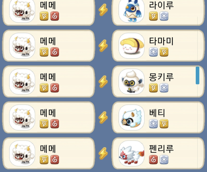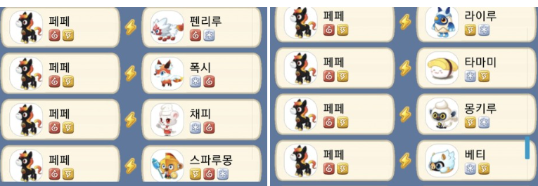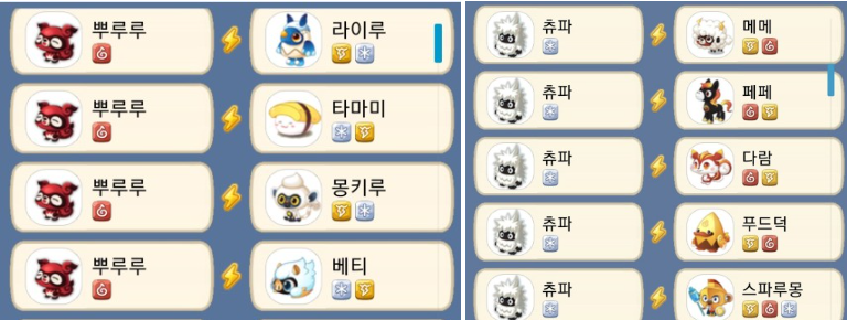 단일 속성으로 맞출 경우에는 뿌루루(불) + 라이루/타마미/몽키루/베티(얼음, 번개)로 하거나 츄파(얼음) + 메메/페페/다람/푸드덕(불, 번개) 등 다양하게 있습니다.