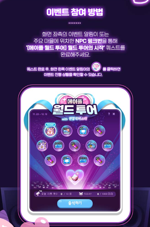이벤트 참여 방법은 화면 좌측의 이벤트 알림이 또는 주요 마을에 위치한 NPC 핑크빈을 통해 '[메이플 월드 투어] 월드 투어의 시작' 퀘스트를 완료해 주세요.