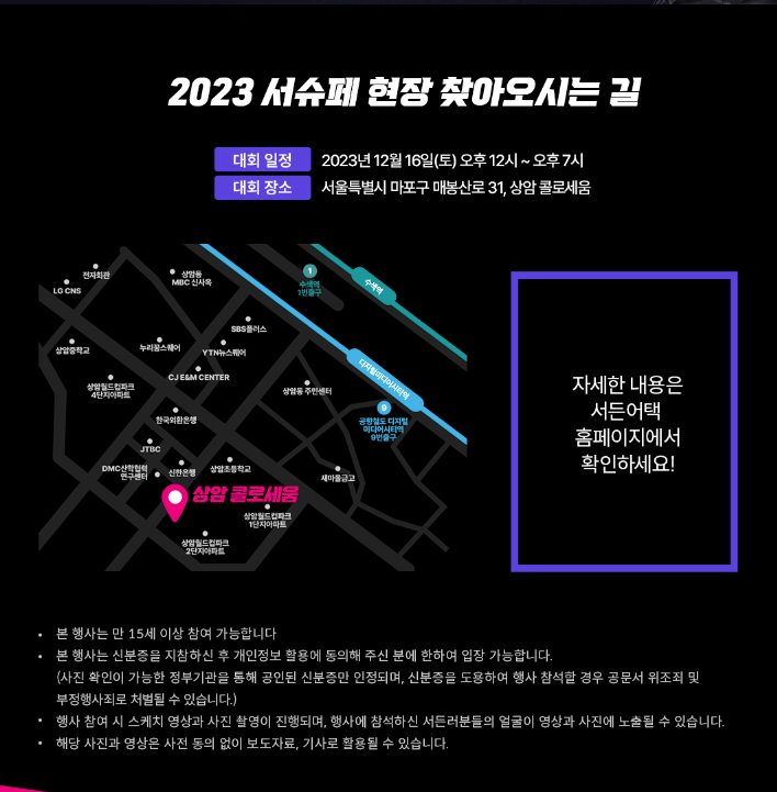 2023 서든 슈퍼 페스티벌은 만 15세 이상 참여 가능하고 신분증을 지참한 후 개인정보 활용에 동의해 주신 분에 한해서 입장 가능하다고 하니 참고해 주시기 바랍니다.