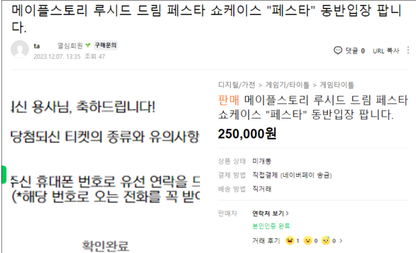 게임 이용자 수 대비 티켓이 워낙 한정적이다 보니 팬들의 갈망도 치솟아 올랐습니다. 자연스럽게 중고 마켓에서는 동반 입장 권한을 판매하는 게시물이 속속 올라왔습니다. 현재 중고 마켓에서 판매되는 루시드 드림 페스타 암표 가격은 20~25만 원입니다.