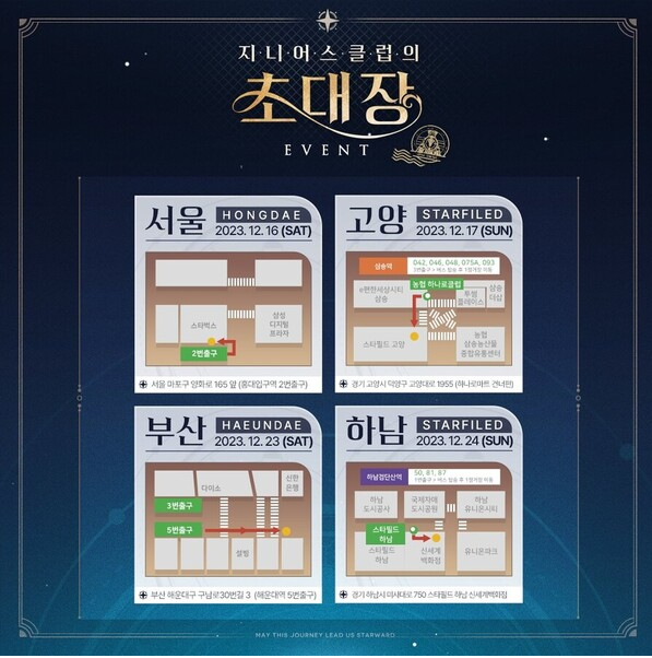 지니어스 클럽의 초대방 이벤트는 오전 10시부터 오후 7시까지 운영됩니다. 지역은 서울, 고양, 부산, 하남에서 각각 12월 3주 차 주말, 4주 차 주말 1일씩 진행될 예정입니다.