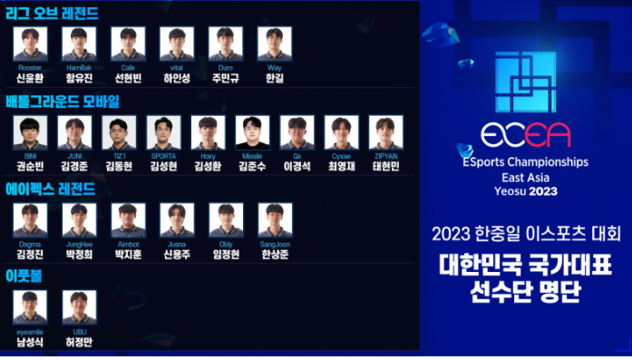한국 e스포츠협회는 12월 8일 문화체육관광부와 함께 주최하는 e스포츠 국가대항전 '2023 한중일 e스포츠 대회' 개막에 앞서 대한민국 국가대표 선수 명단을 발표했습니다.