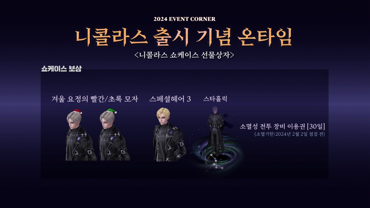'사이퍼즈'는 12월 12일 '니콜라스' 업데이트를 기념해 이벤트를 실시합니다. 1월 25일까지 접속만 해도 30일 간 주요 전투 장비를 무료로 사용할 수 있는 '전투 장비 이용권'을 받을 수 있으며, 장소에 관계없이 접속 유지 시간에 따라 산타 모자, 무기 액세서리 등 크리스마스 콘셉트의 다양한 보상을 얻을 수 있습니다. 또, 플레이 보상으로 통합 교환소에서 사용 가능한 각종 이벤트 재화를 제공할 계획이라고 합니다. 통합 교환소에서는 '니콜라스' 전용 코스튬, 헤어 액세서리. 로딩 포스터 등을 만날 수 있습니다.