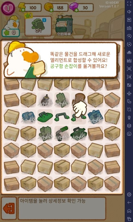 이 게임에서 가장 중요한 부분인 엘리먼트(아이템)들을 합성하여 상단에 나와있는 것들을 모아서 주게 되면 여러가지의 운동기구들과 새로운 장소 등 만들 때 필요한 재화를 얻을 수 있습니다.