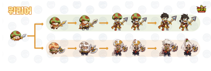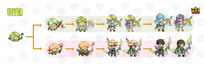 아처로 전직 이후 2차 ~ 4차 전직까지 활을 메인으로 사용하는 직업과 석궁을 주로 사용하는 직업으로 나뉘어져 있습니다.