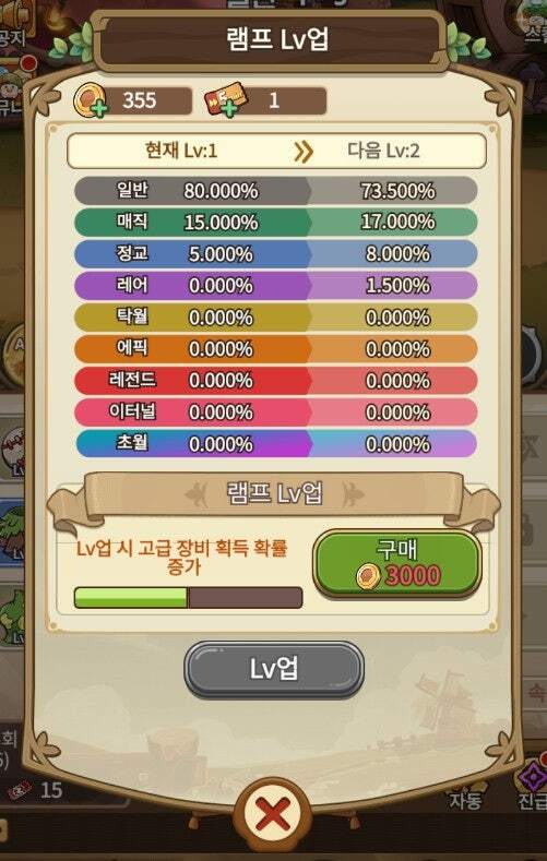 골드를 사용하여 램프 레벨을 업그레이드시킬 수 있습니다. 레벨이 높을수록 더욱 좋은 장비를 획득할 수 있습니다.