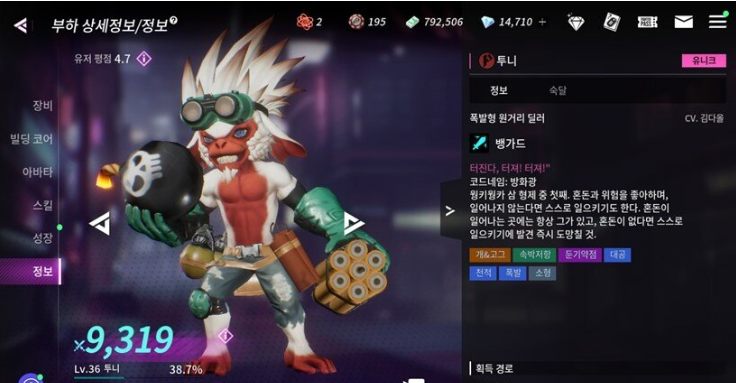 공중에 있는 적을 공격해 다운시키는 '대공 폭탄' 스킬까지 보유하고 있어 상대하기 까다로운 공중 타입 적을 상대로도 매우 유용합니다.