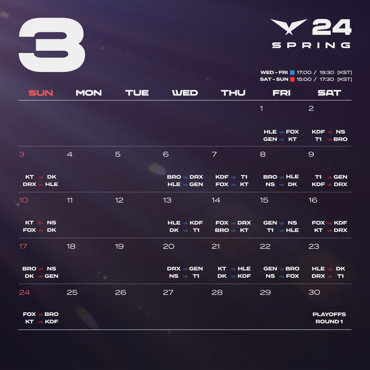 1월 17일 개막하는 2024 LCK 정규리그는 3월 24일(일)까지 진행되며 정규 리그 1위부터 6위까지 랭크된 팀들이 참가하는 플레이오프는 3월 30일(토)부터 더블 엘리미네이션 방식으로 치러집니다. 4월 14일(일) 대망의 결승전을 치릅니다.