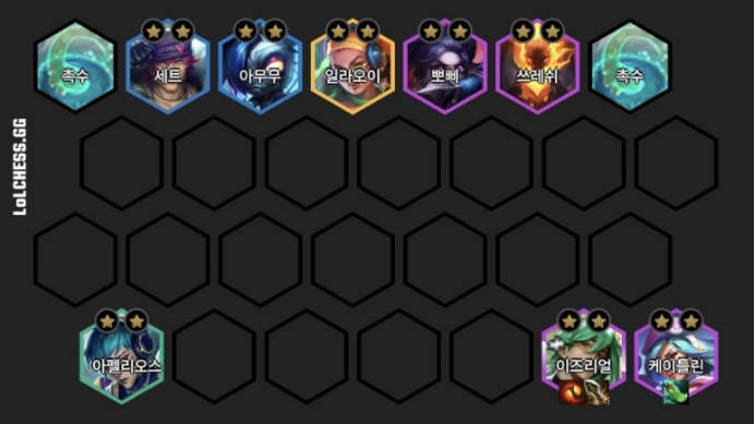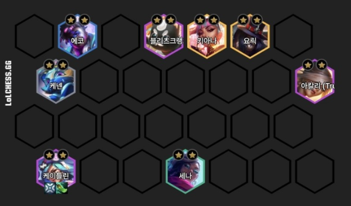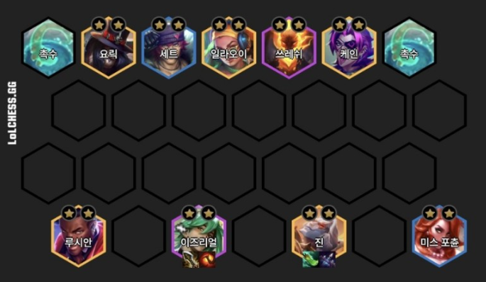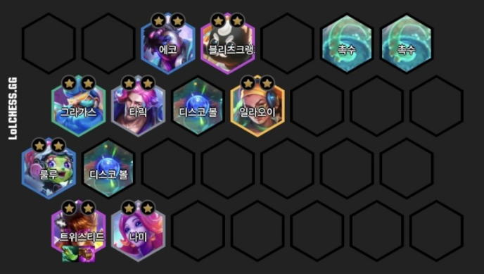 헤드라이너 거물 이즈가 가장 좋지만 8비트나 속사포 케틀도 좋고 앞라인 헤드라이너 모두 활용할 수 있습니다. 미포나 가렌 등의 기물을 상황에 따라 추가해 주시면 됩니다.