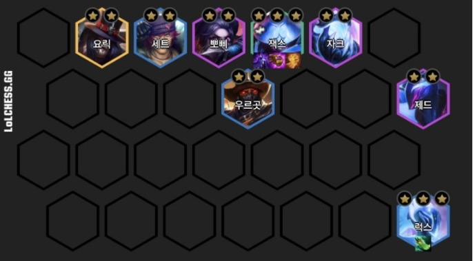 현재 리롤 덱 중 제일 쎈 덱입니다. 6 렙에서 잭스 3성 7 렙에서 럭스, 세트 3 성작 보시면 됩니다.
