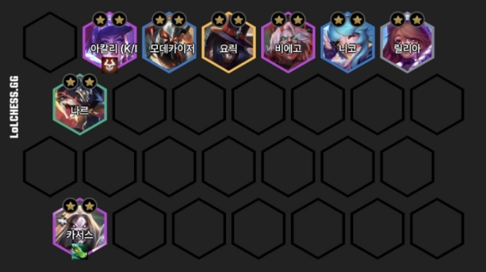 헤드라이너는 펜타킬 카서스나 펜타킬 비에고가 가장 좋습니다. 정 안 나온다 싶으면 처형자 아칼리 헤드라이너도 나쁘지 않습니다. 카서스 쇼진 정도가 필수이며 브루저 템은 아칼리, 비에고 중 먼저 2 성작 된 기물에 넣어주면 됩니다.