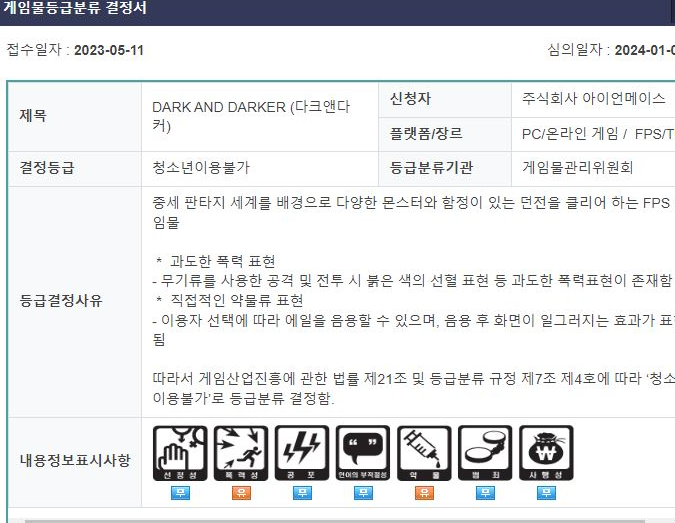 게임물관리위원회는 당초 <다크 앤 다커>의 등급분류 심의에 대해서 "가처분 소송 결과를 지켜보고 있다"라고 밝힌 적 있습니다. 아이언메이스의 최초 접수는 2023년 5월 11일, 게임위의 등급분류 결정은 2024년 1월 4일 이루어진 것으로 확인됩니다.