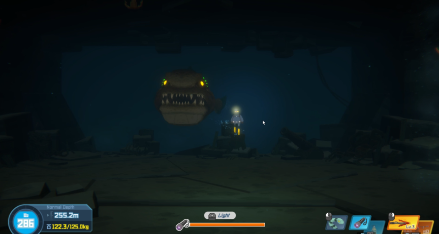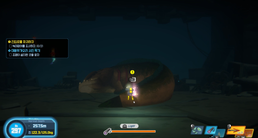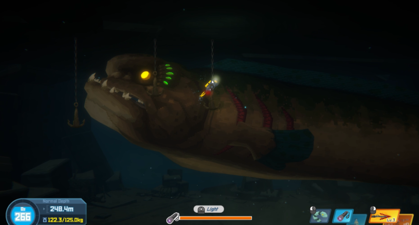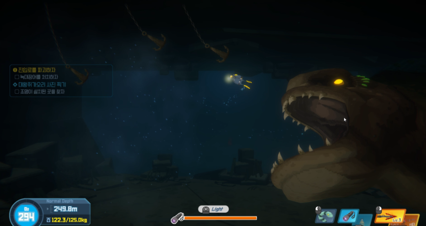 최대한 벗어나서 먹히지 않게 조심해야 합니다. 왼쪽에 닻을 잡고 있으면 버틸 수 있습니다. 늑대장어에게 먹히면 산소 수치가 많이 깎일 수 있으니 해당 패턴에서는 공격 보단 방어가 중요합니다.