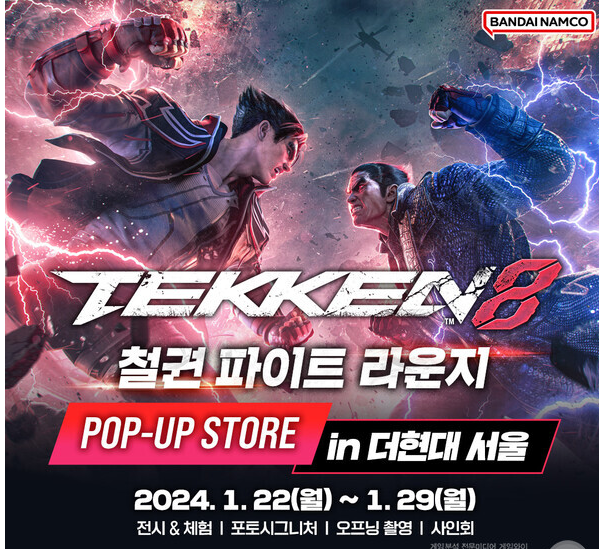 반다이남코엔터테인먼트가 1월 22일부터 '철권 8'의 출시를 기념하는 팝업스토어인 '철권 파이트 라운지'를 여의도에 위치한 더현대 서울에서 오픈한다고 합니다. 철권 파이트 라운지에서는 '철권 8'의 패키지 및 굿즈 판매를 시작으로 기존에 볼 수 없었던 '철권' 시리즈의 작품의 전시와 함께 다양한 체험 프로그램이 준비될 예정입니다. 이번 팝업스토어는 오는 29일까지, 약 8일간 더현대 서울 지하 1층 이벤트 플라자에서 진행될 예정입니다.