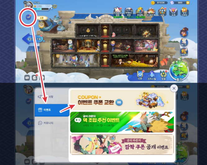 인게임에서 쿠폰 사용의 경우 좌측 상단 공지 사항 터치 > 이벤트 > 이벤트 쿠폰 교환에 입력하시면 됩니다.