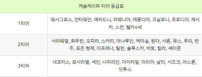 캐슬케이퍼 티어 등급표입니다. S+ 등급을 차지한 웨사그로스, 얀타웨인 등을 1티어로 분류했으며,