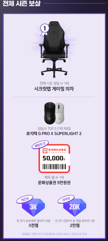 예측 적중 1위에겐 시크릿랩 게이밍 의자, 상위 5인에게는 로지텍 G PRO 슈퍼라이트 마우스를 선물합니다.