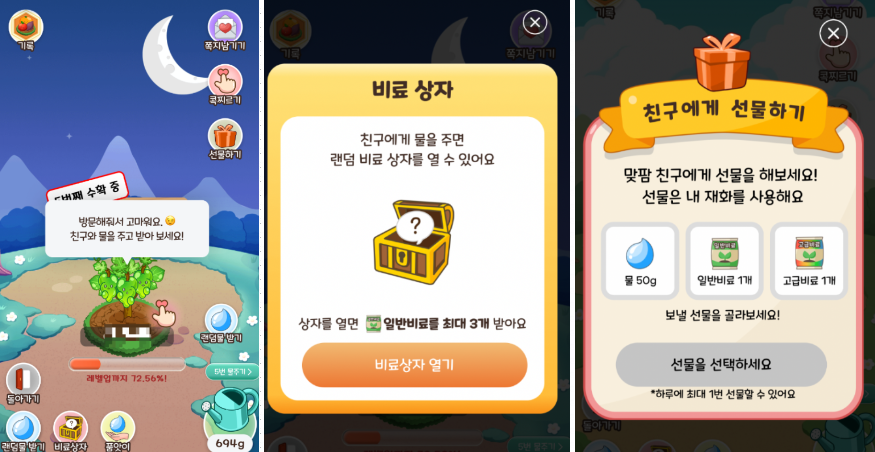 그리고 비료 상자 아이콘을 누르거나 친구 작물을 처음으로 주게 되면 1 ~ 3 개의 일반 비료 획득이 가능하며 친구에게 선물을 줄 수도 있습니다.