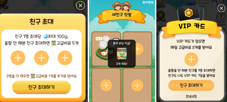 친구 초대 이벤트도 있습니다. 친구 1명 초대 시 최대 100g의 물을 받을 수가 있으며 3명을 다 채우게 되면 초대 시 고급비료 1개를 획득할 수 있습니다. 올팜을 한 번도 플레이 안 해본 친구가 있다면 초대 시 고급비료 5개 획득할 수 있습니다.