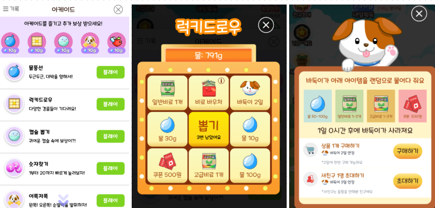 아케이드를 즐겨도 보상 획득이 가능합니다. 참여만 해도 기본적으로 10g의 물을 받을 수가 있습니다.