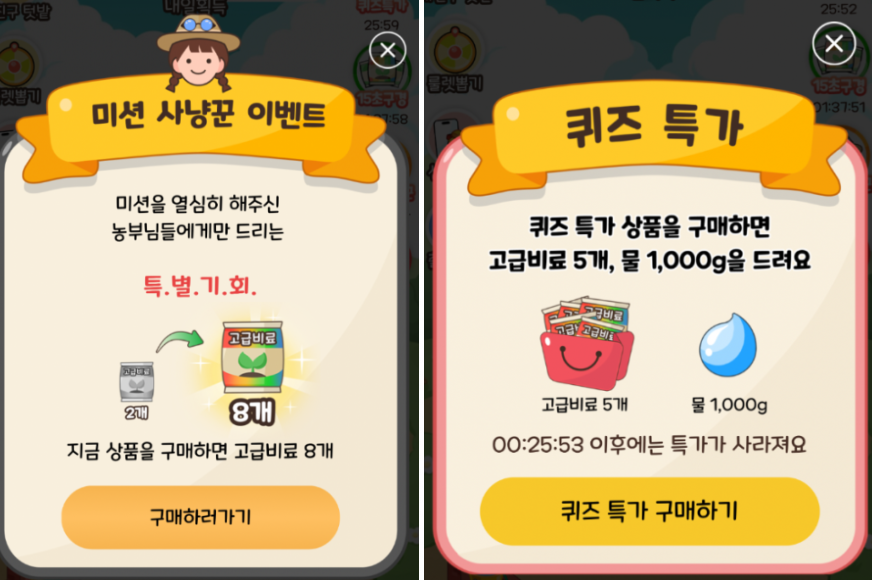 농작물을 키우기 위해서는 비료, 물이 필수로 필요하기 때문에 매일 출석 보상을 통해서 챙겨 보시면 됩니다.