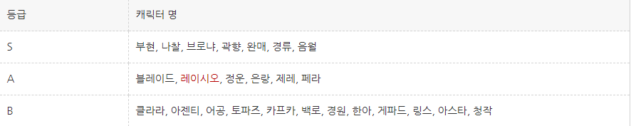 최근 붕괴 스타레일 티어표 등급표입니다. 레이시오의 픽률은 아직 공개되지 않았지만, 현재 가장 강력하다고 알려져 있는 딜러 경류, 음월에 비해서는 성능이 아쉽다는 의견이 있습니다.