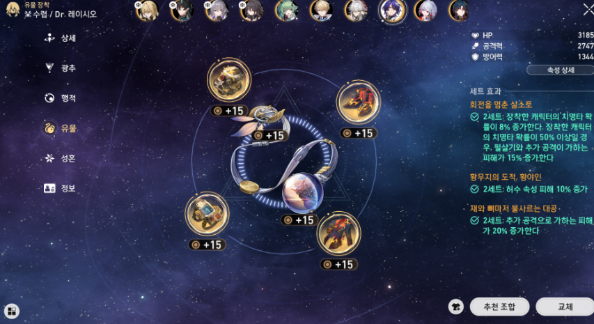 다음으로 레이시오 유물을 알아보겠습니다. 현재 1.6 버전 기준에서는 황야인 2세트, 대공 2세트, 살소토 2세트가 무난해 보입니다. 메인 속성의 경우 바디는 치명타 피해 or 확률, 신발은 속도 or 공격력 %로 고르시면 됩니다.