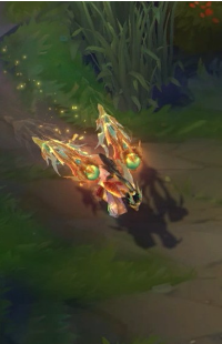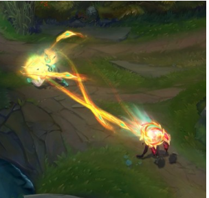 기본 공격은 연두색과 붉은색이 섞인 긴 투사체입니다. 이에 맞게 되면 동그랗게 빛이 번지듯 이펙트가 생기고 치명타 발생에는 노란색의 밝은 원 이펙트가 생깁니다.