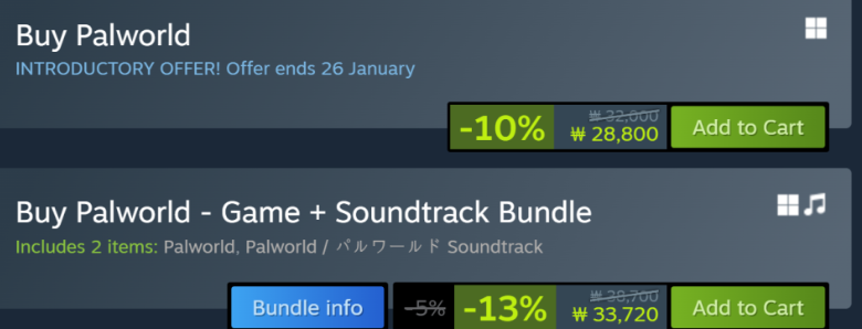 팔월드 가격은 현재 28,800원에 판매되고 있으며 10퍼센트 할인이 1월 26일까지 진행된다고 합니다.