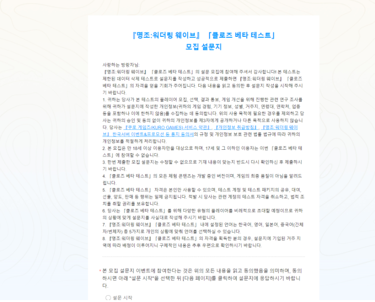 테스트 모집을 누르면 설문조사 팝업이 나오며, 이용하는 플랫폼, 게임 이용 시간, 플레이 경험 등 다른 모바일게임의 CBT 설문조사와 비슷합니다. 클로즈 베타 테스트는 PC, 안드로이드, IOS 플랫폼을 지원합니다. 테스트 기간 충전 서비스는 오픈되지 않으며, 테스트가 끝난 후 모든 게임 데이터는 삭제됩니다. 테스트 오픈 및 종료 시간은 별도 공지된다고 합니다.
