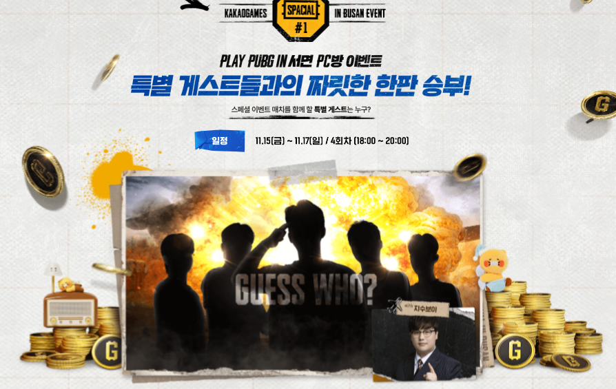 특별 게스트분들도 온다고 하는데요 지수보이님도 오신다고 합니다! 16일 오후 5시에는 창현거리노래방이랑 콜라보 이벤트도 한다네요. 배그 캐릭터 코스프레하고 참여하시면 지코인 쿠폰이랑 카카오프렌즈 굿즈도 받을 수 있어요.