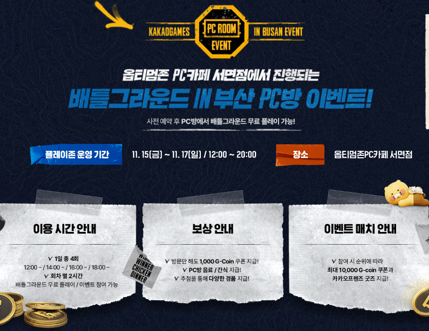 11월 15일부터 17일까지 부산 서면에 있는 옵티멈존 PC카페에서 PLAY PUBG IN 서면 행사가 열린다고 해요!