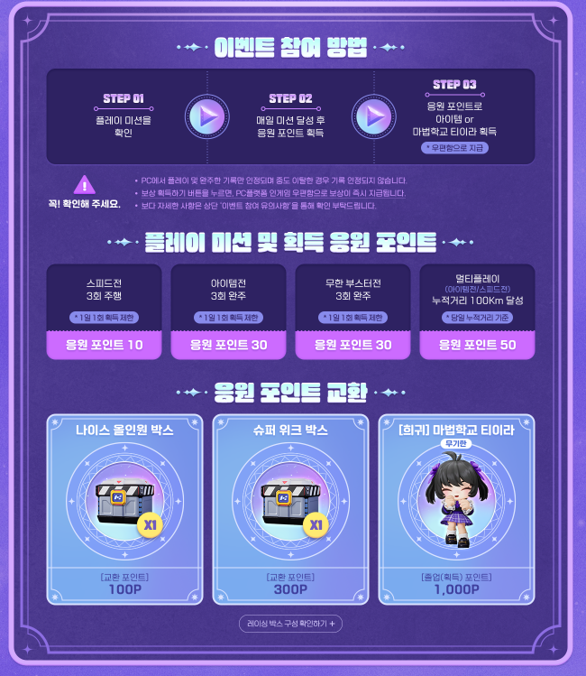 스피드전 3회 주행, 아이템전 3회 완주, 무한부스터전 3회 완주, 멀티플레이 누적거리 100KM달성 이렇게 해서 응원 포인트 점수를 모아준다음 포인트를 모음만큼 교환을 할수 있는데요. 나이스 올인원박스 100P, 슈퍼워크박스 300P, 마법학교 티아라 1,000P 등 원하는 선물로 받으시면 되겠습니다 티아라 캐릭터 좀 탐나는데요?