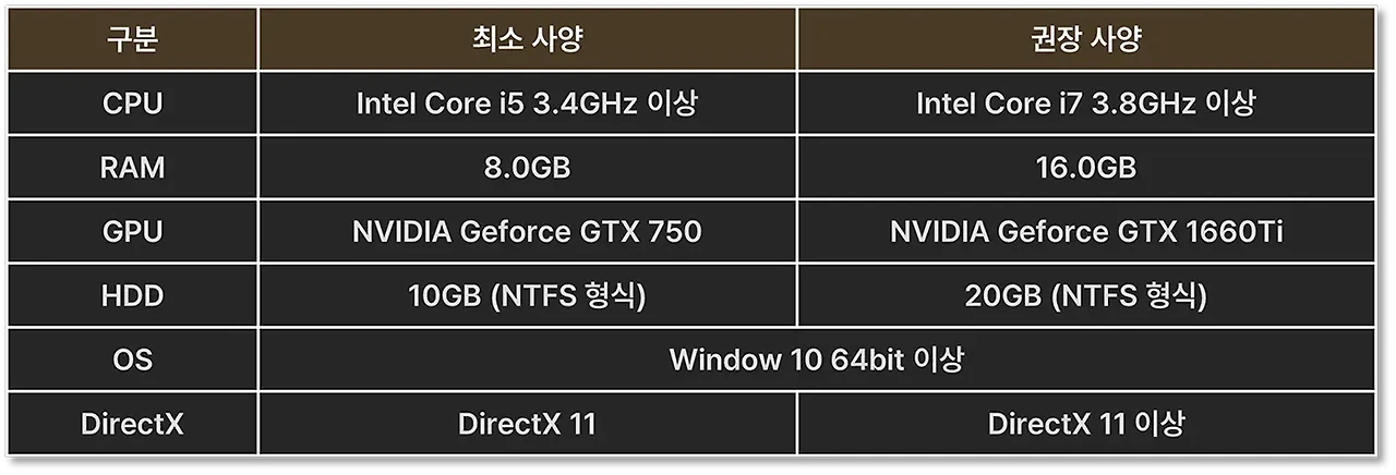 게임을 실행하기 위한 최소 및 권장 시스템 사양이며, PC 환경에 따라 원활한 게임 진행이 어려울 수 있습니다.