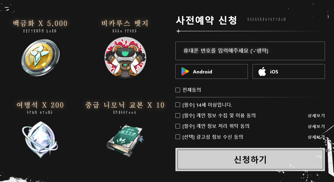- 공식 홈페이지 사전예약 시: 백금화 5천 개, 비카루스 뱃지, 여명석 200개 등