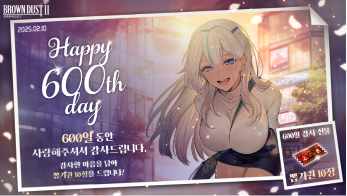 600일 기념 이벤트: 2025년 2월 10일부터 2월 13일까지 모든 유저에게 뽑기권 10장을 지급하는 이벤트가 진행됩니다. 이는 유저들의 성원에 대한 감사의 표시입니다.