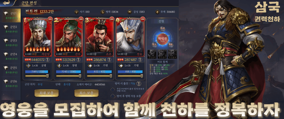 첫째로 그래픽이 정말 대단해요! 3D 렌더링으로 구현된 무장 일러스트들이 너무 멋지더라구요. 특히 유명한 장수들, 예를 들어 조조나 관우 같은 무장들의 모습이 섬세하게 표현되어 있어서 정말 인상적이었습니다.