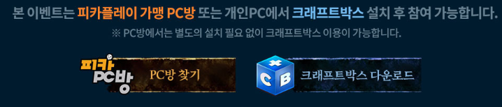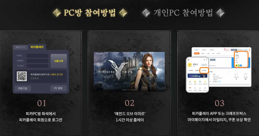 - 참여 방법: 피카PC방 또는 집에서 크래프트박스를 통해 레전드 오브 이미르 1시간씩 플레이
